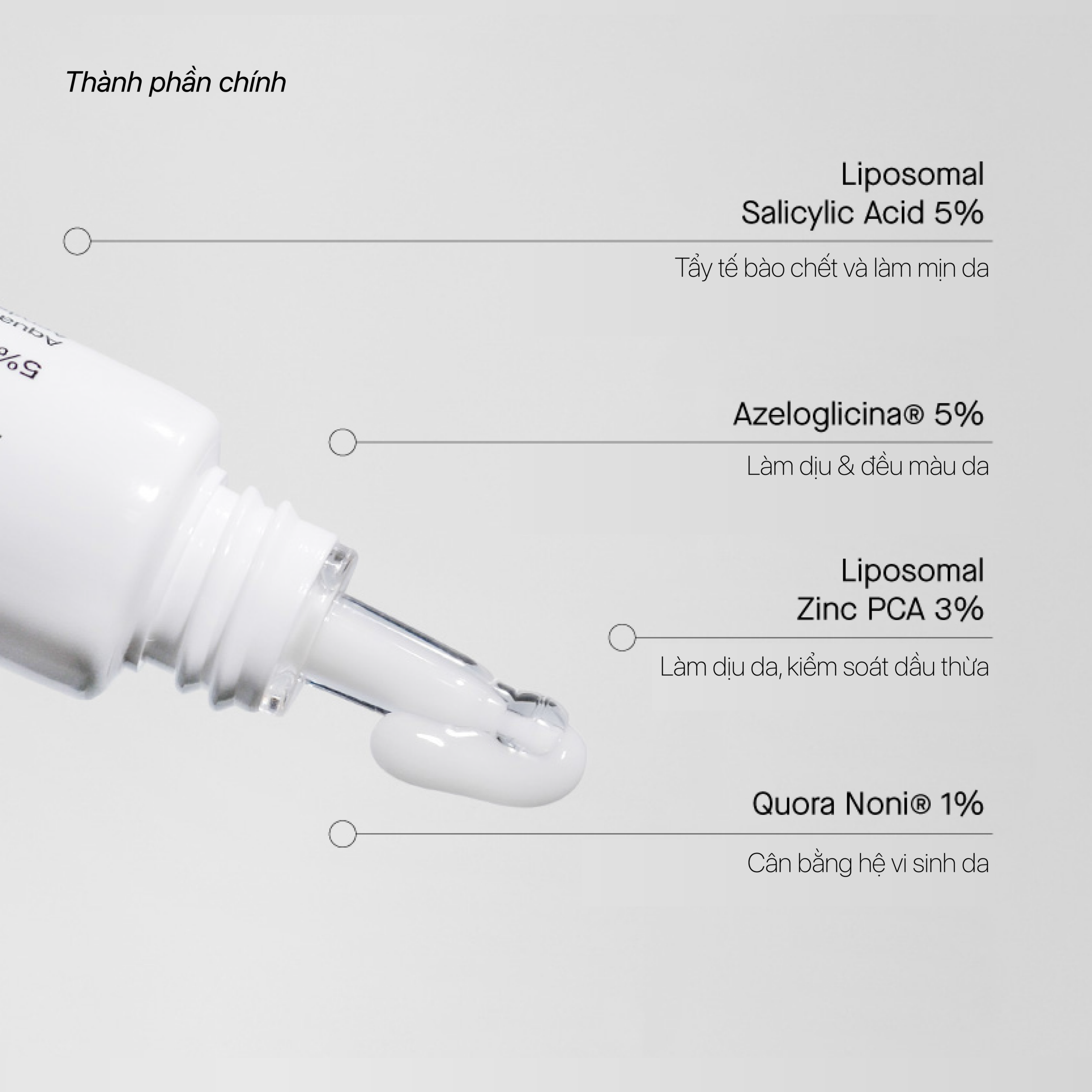 Adult Acne Treatment sử dụng các hoạt chất BHA và Zinc PCA dạng bao vi nang, giúp giải phóng chậm và giảm nguy cơ kích ứng so với acid truyền thống. Sản phẩm cũng chứa Azeloglicina® và Quora Noni® – hai thành phần có đặc tính kháng viêm & làm dịu, nên khá an toàn cho da mụn nhạy cảm.
