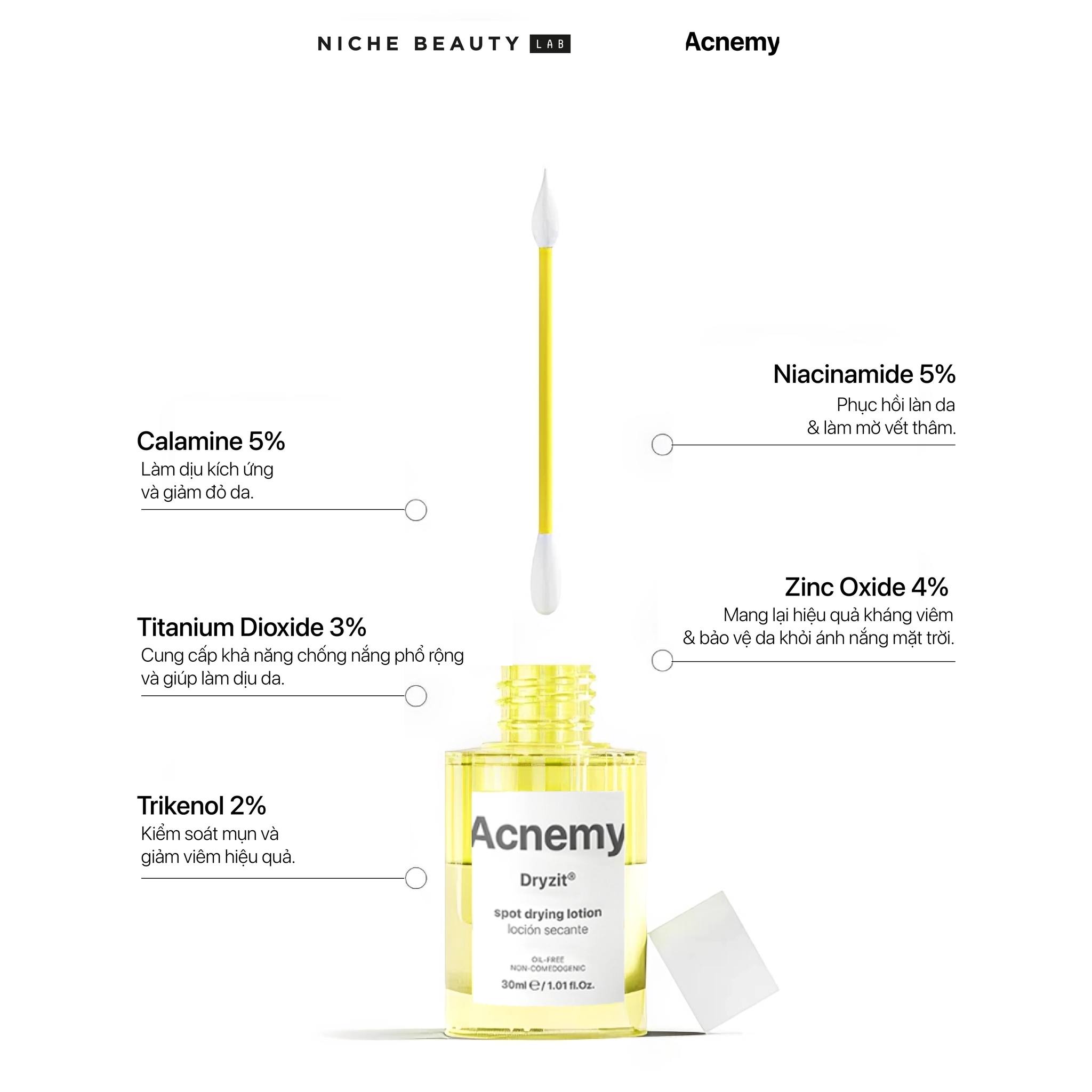 Sản phẩm được chia làm 02 lớp tách riêng biệt. Chất lỏng phía trên được pha trộn với phức hợp Salicylic Acid, Zinc Oxide và Niacinamide giúp loại bỏ cặn bẩn và tế bào chết gây nên nhân mụn; trong khi Calamine có trong lớp bột trắng phía đáy chai giúp làm giảm kích ứng và làm dịu da. Công thức đặc biệt giúp loại bỏ mụn mủ, viêm cực nhanh chóng.