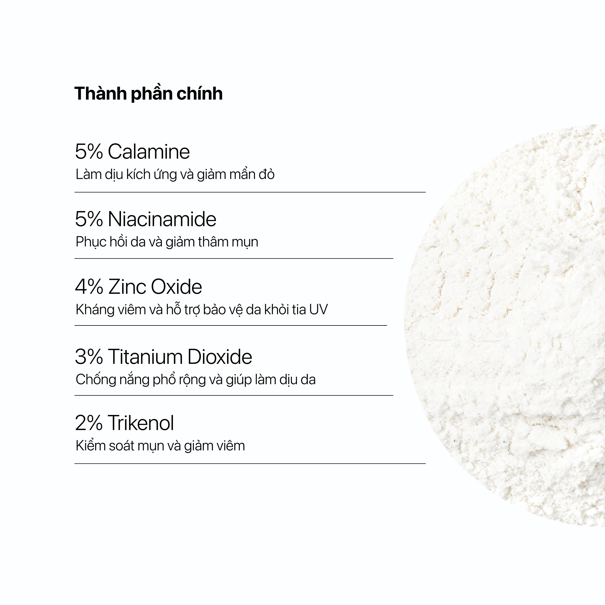 Lớp bột Calamine ở đáy lọ có khả năng làm dịu mạnh mẽ, giảm kích ứng và xoa dịu vùng da đang viêm. Khi chấm trực tiếp lên nốt mụn mủ, Calamine giúp giảm đỏ và cảm giác khó chịu, đồng thời hỗ trợ khô còi mụn nhanh hơn.