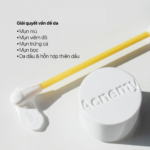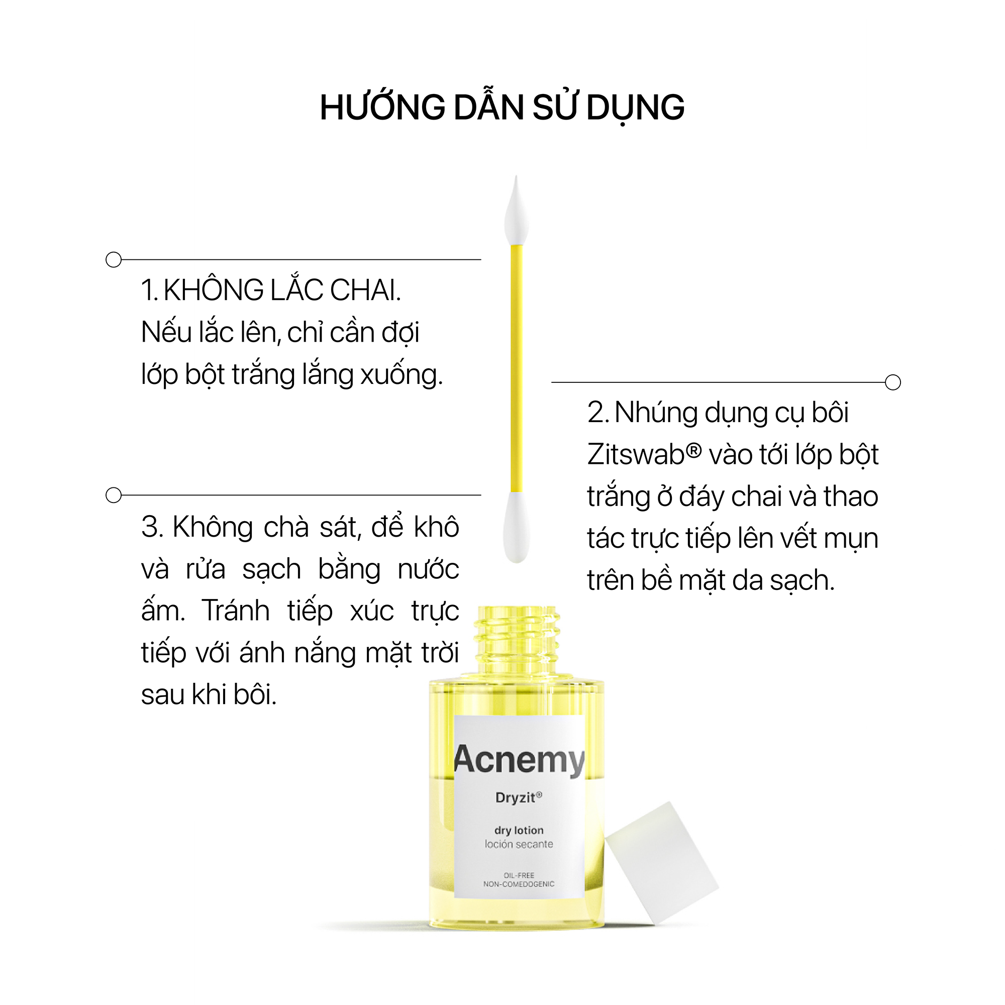Nhúng dụng cụ bôi Zitswab® vào tới lớp bột trắng ở đáy chai và thao tác trực tiếp lên vết mụn trên bề mặt da sạch.