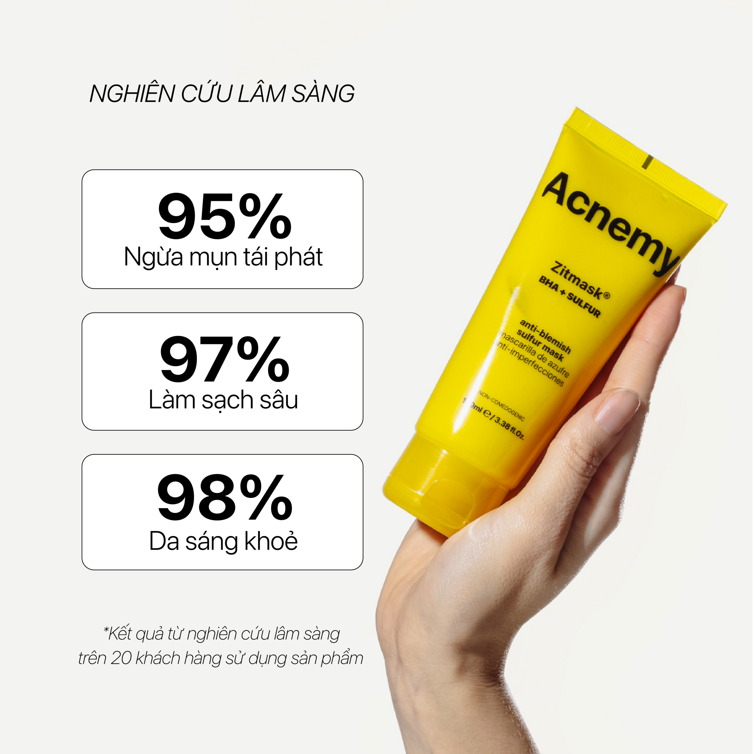 Zitmask® nổi bật nhờ sự kết hợp nồng độ cao Sulfur (10%) và Salicylic Acid (2%) trong một công thức cân bằng, tập trung xử lý nguyên nhân gốc rễ của mụn và bít tắc: dầu thừa và lỗ chân lông kém thông thoáng. Không chỉ giúp làm sạch bề mặt da, mặt nạ còn hỗ trợ thanh lọc sâu trong lỗ chân lông, từ đó giảm mụn đầu đen, hạn chế bóng nhờn và ngăn mụn tái phát. Sản phẩm mang lại hiệu quả làm sạch rõ rệt nhưng vẫn giữ da mềm mịn, không khô căng quá mức.
