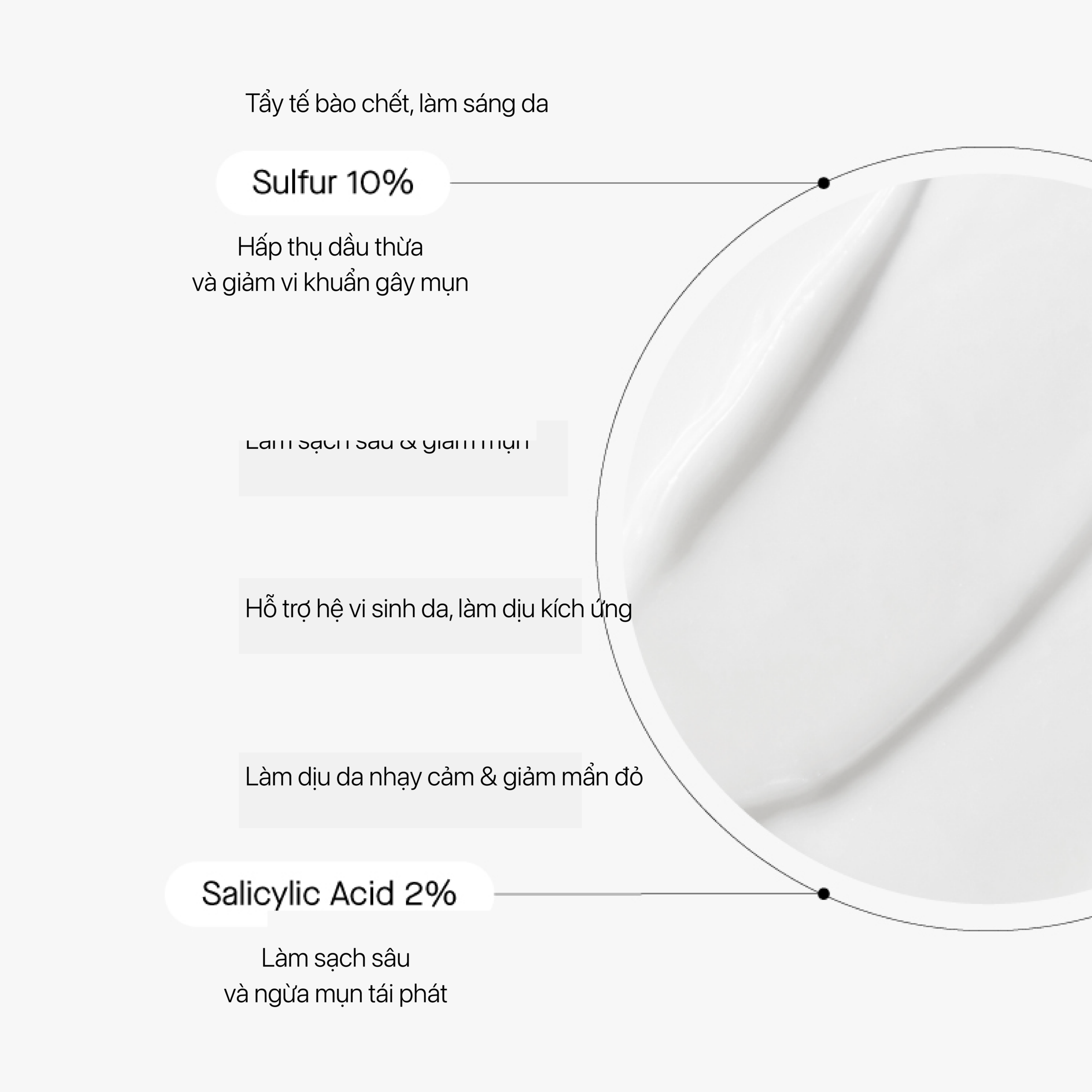 Công thức chứa 10% Sulfur với đặc tính kháng khuẩn và kháng viêm mạnh, hỗ trợ làm sạch lỗ chân lông, kiểm soát dầu thừa và giảm mụn hiệu quả. Kết hợp 2% Salicylic Acid giúp tẩy tế bào chết nhẹ nhàng, làm thông thoáng lỗ chân lông, ngăn ngừa mụn đầu đen và hạn chế mụn mới hình thành. Sau khi sử dụng, làn da trở nên mềm mịn, đều màu và ít bóng dầu hơn rõ rệt.