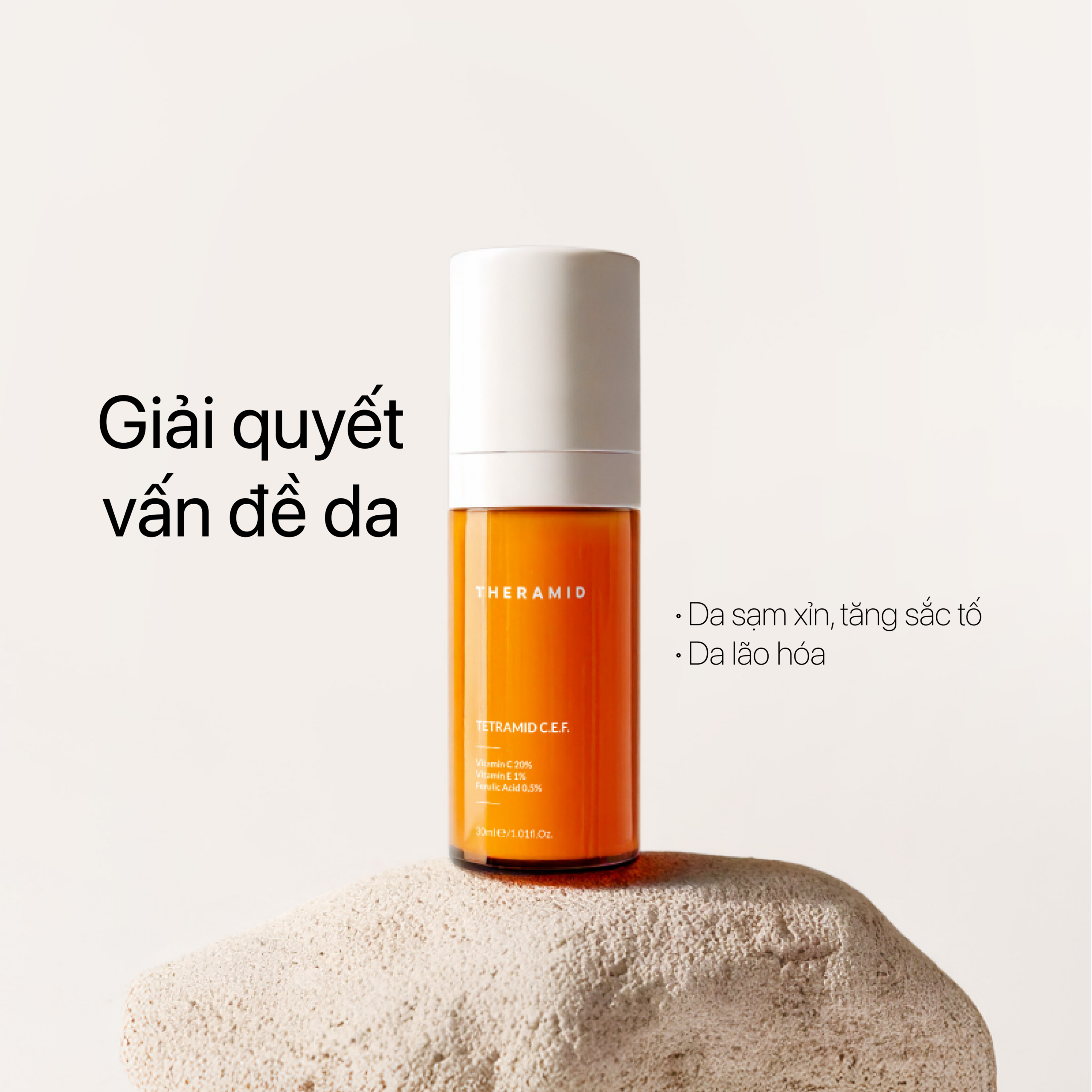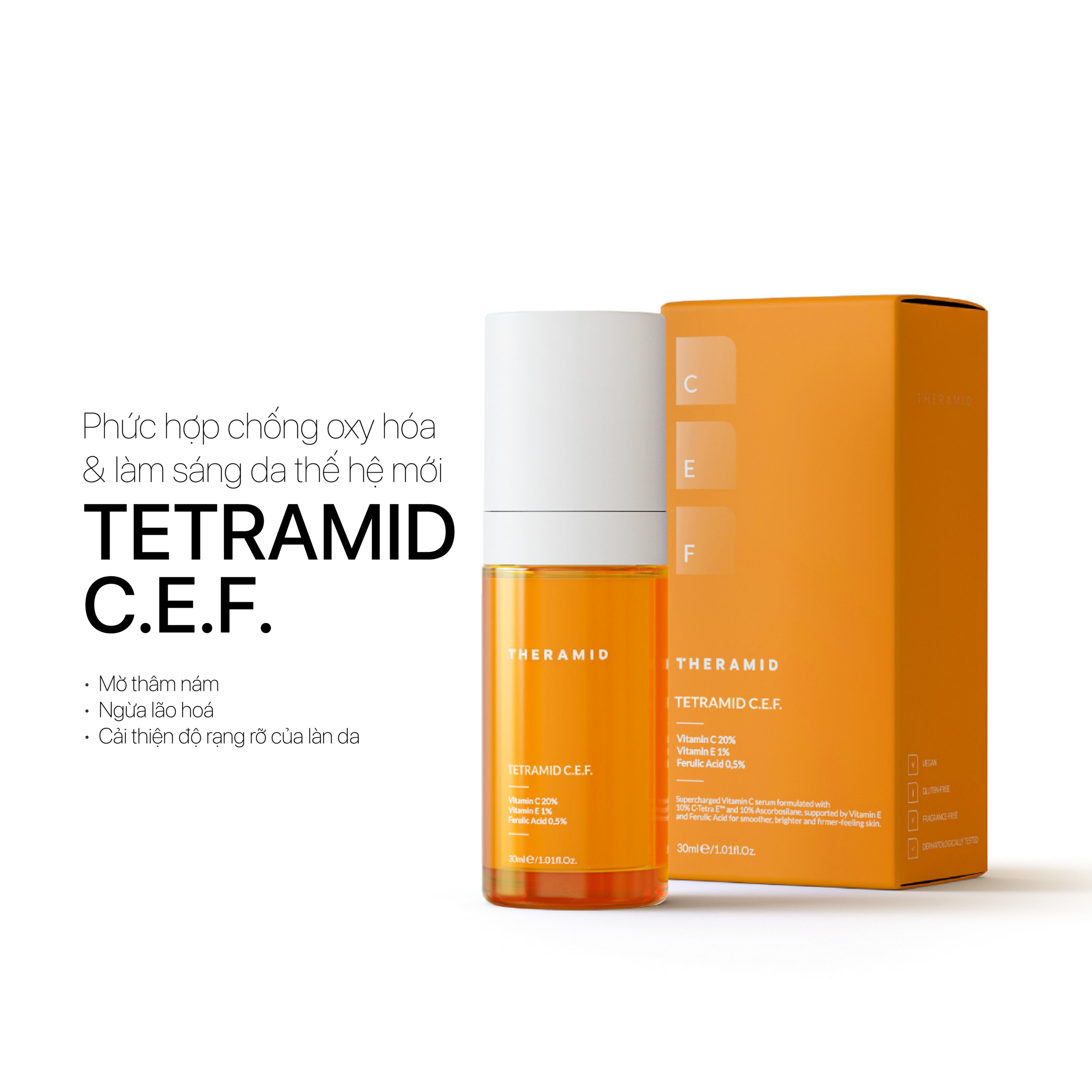 Phức hợp Tetramid C.E.F chứa 20% Vitamin C với Vitamin C Tetra thẩm thấu sâu, giúp giảm thâm và kích thích sản sinh collagen, chống nếp nhăn từ bên trong. Kết hợp Ascorbosilane và Ascorbyl Glucoside ổn định, cải thiện tông da và làm đều màu bề mặt. Vitamin E và Acid Ferulic tăng cường khả năng chống oxy hóa, bảo vệ da toàn diện suốt cả ngày, mang lại làn da sáng, mịn và săn chắc.