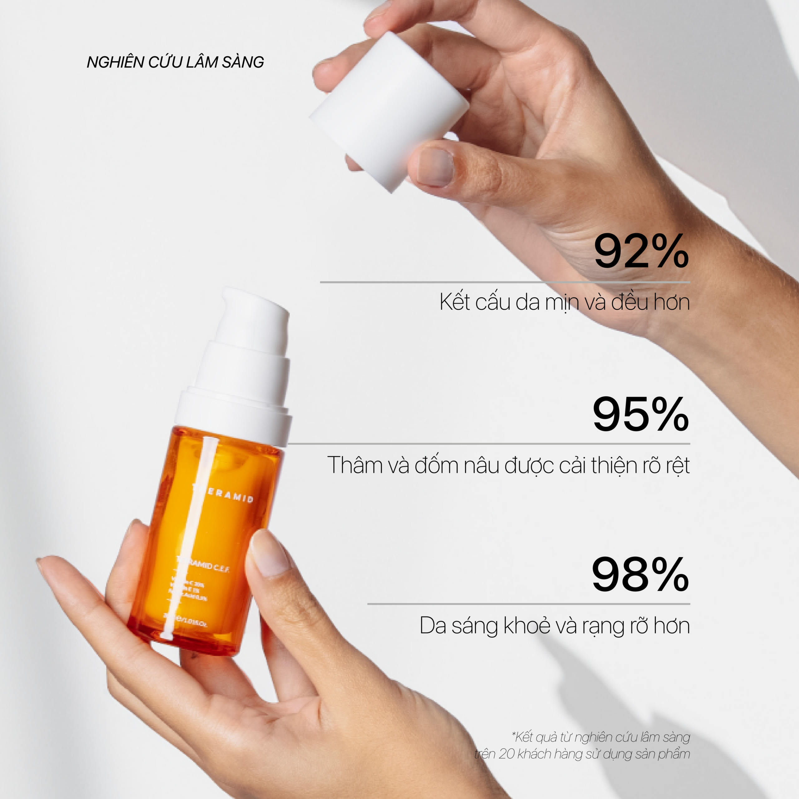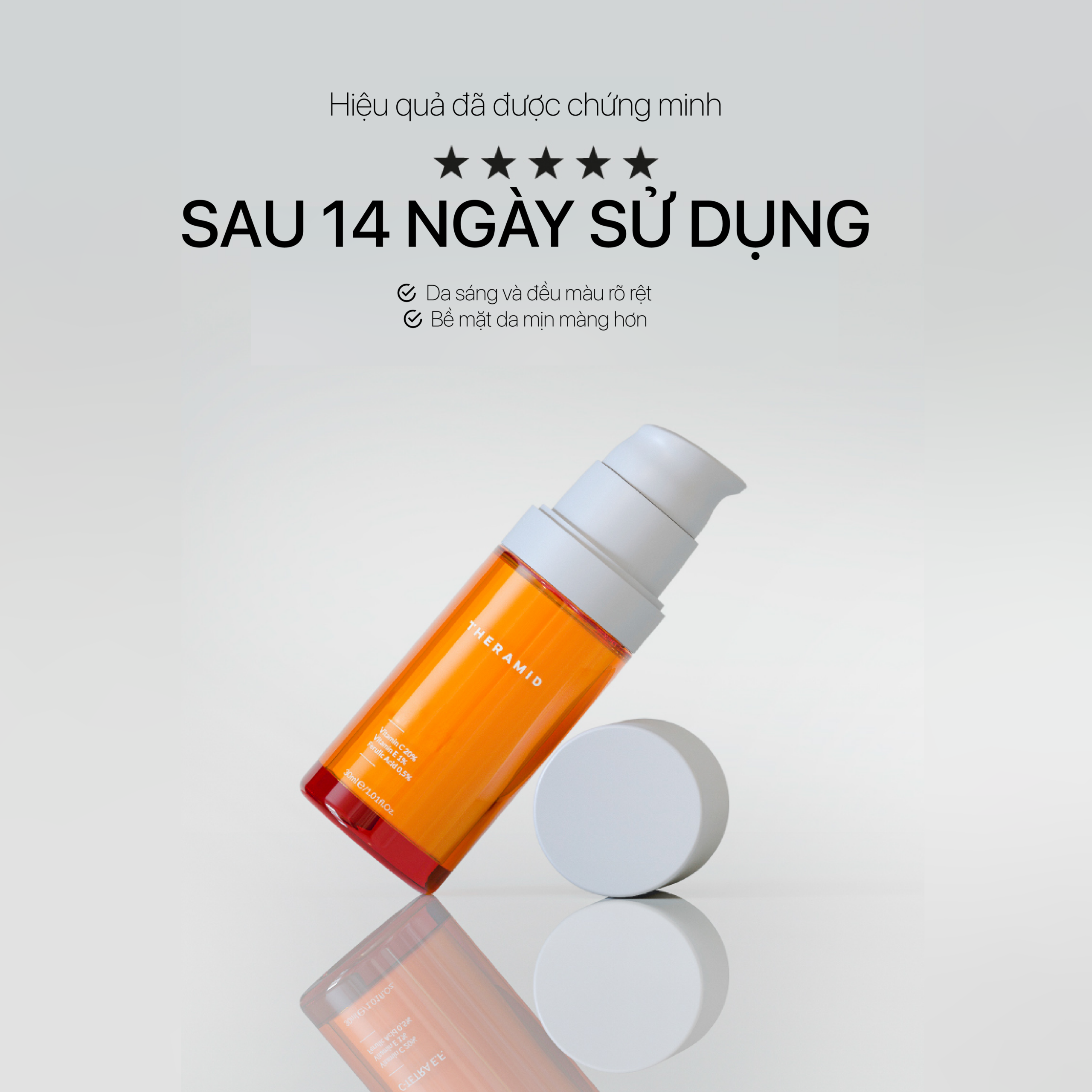 Huyết thanh cô đặc chứa 20% tổ hợp 3 dẫn xuất bền vững của Vitamin C, gồm 10% Vitamin C Tetra và 10% phức hợp Ascorbosilane – Ascorbyl Glucoside cùng Vitamin E và Ferulic Acid, giúp ức chế sắc tố, tăng tổng hợp collagen cho làn da sáng, mịn, săn chắc hơn, đồng thời bảo vệ làn da xuyên suốt và liên tục trong ngày.