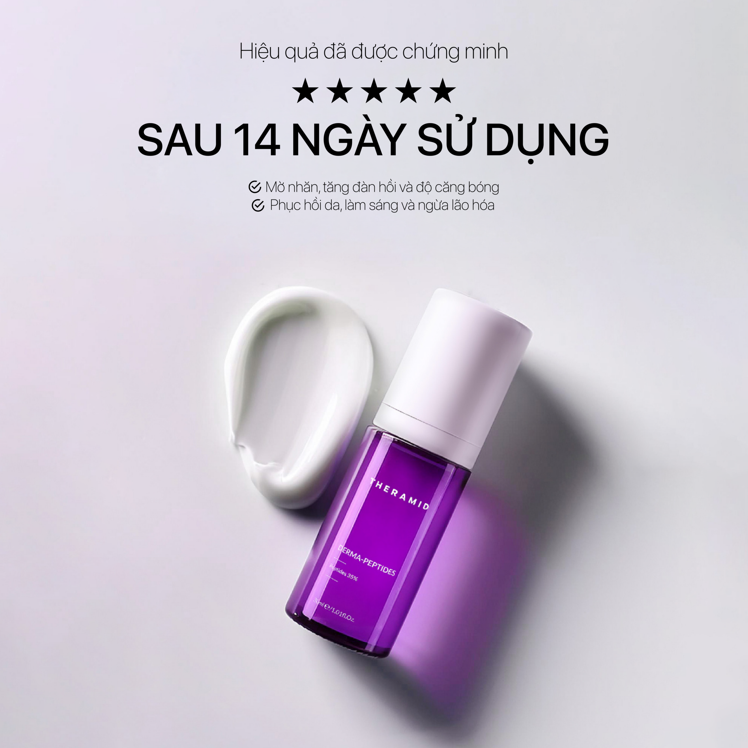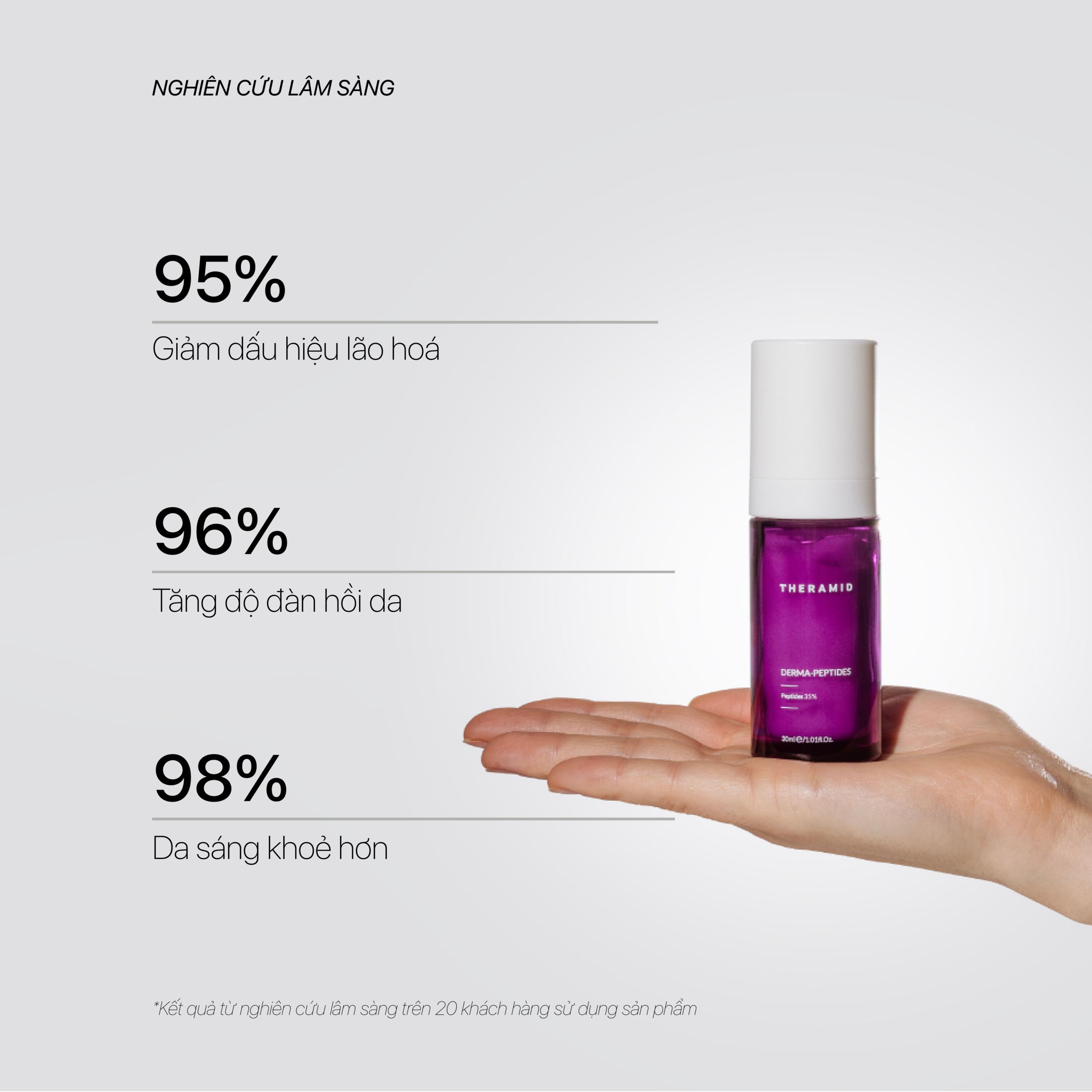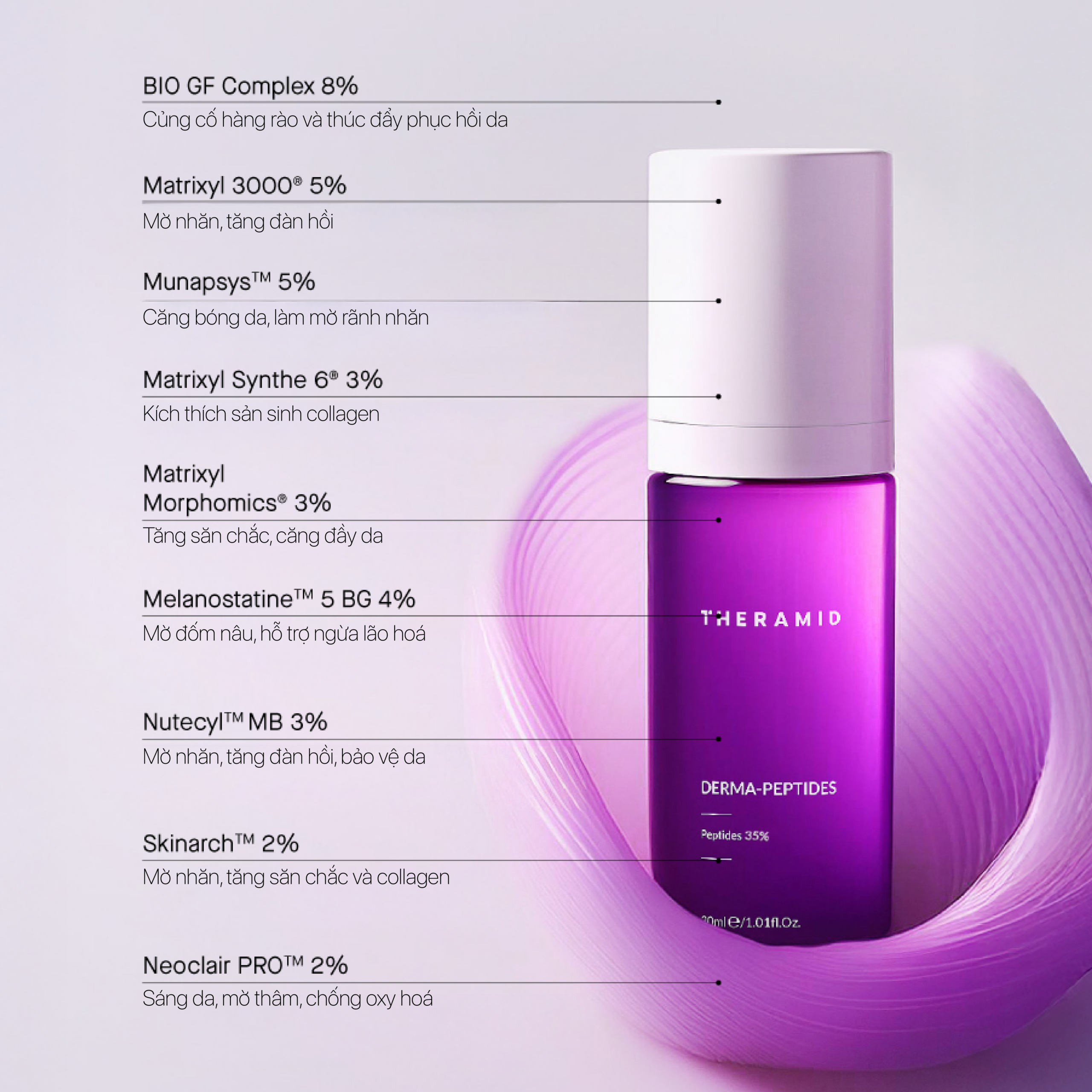 Theo thời gian, làn da dần mất đi “tín hiệu tự sửa chữa” khiến nếp nhăn, rãnh nhăn và dấu hiệu lão hóa xuất hiện sớm. Derma-Peptides 35% là giải pháp tối ưu giúp da trở nên rạng rỡ, mềm mại và tươi trẻ hơn, mang lại cảm giác căng mướt ngay khi chạm và giúp bạn tự tin hơn với làn da mỗi ngày.