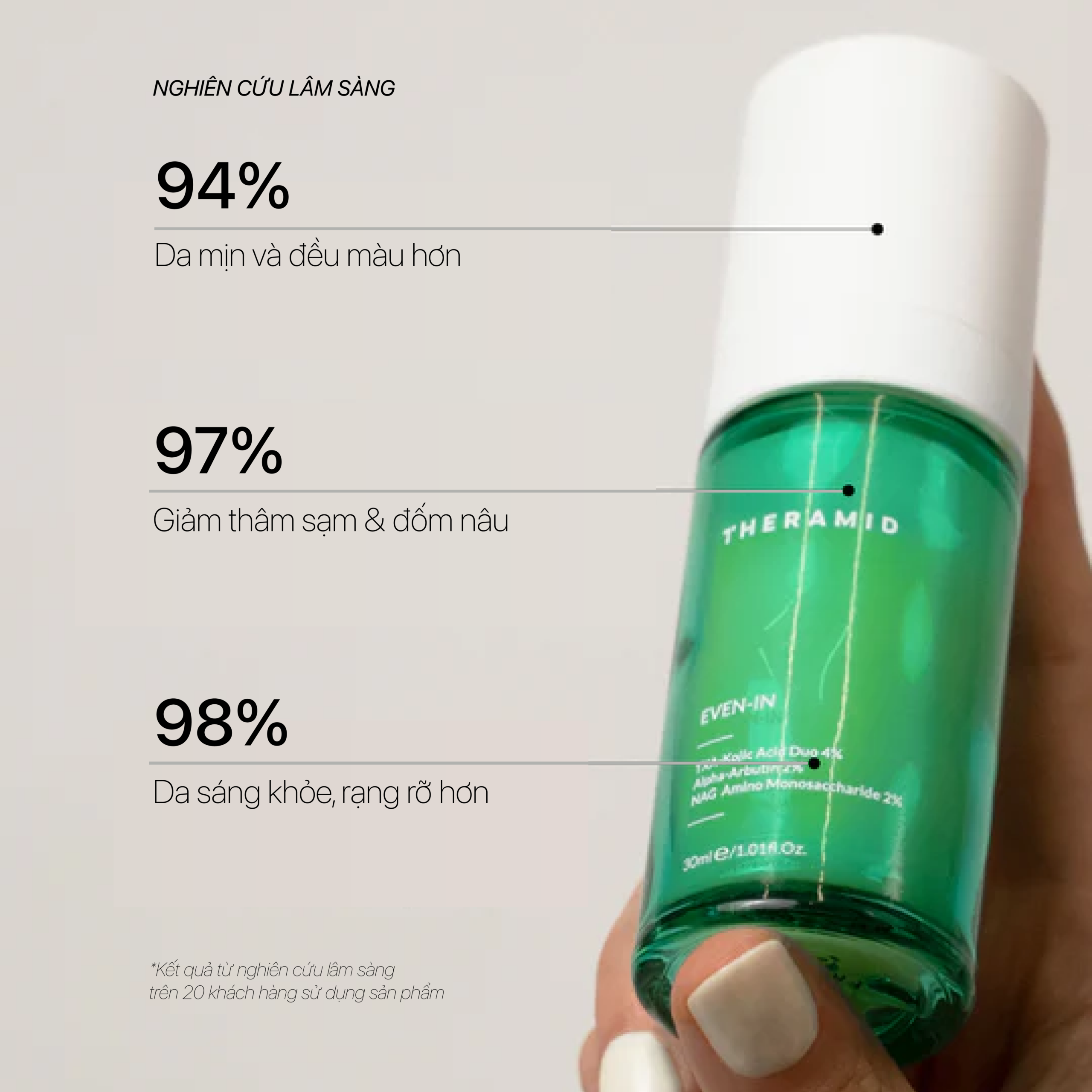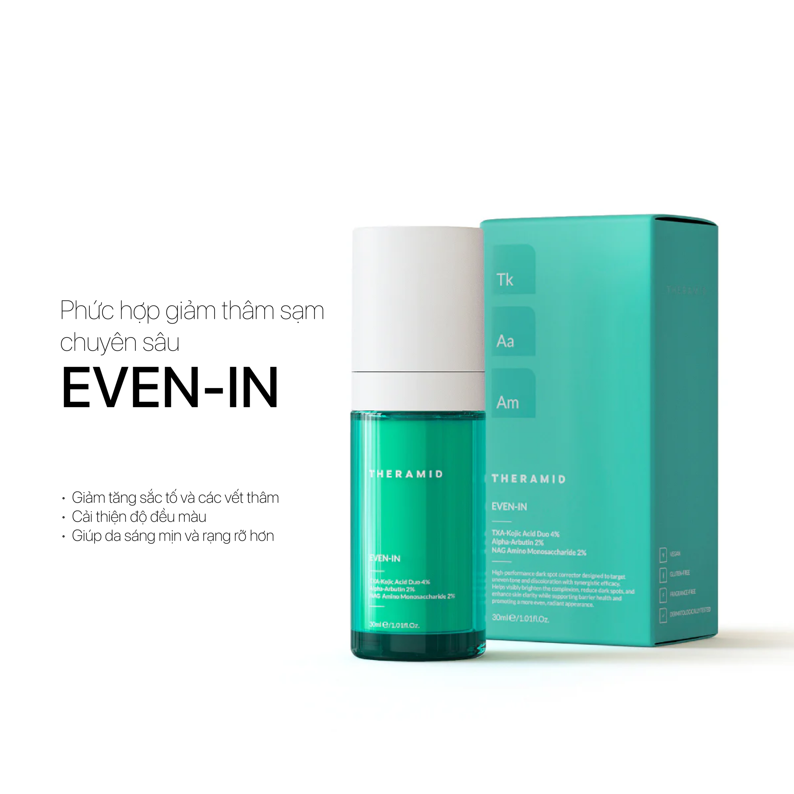 Phức hợp làm sáng chuyên sâu được thiết kế để giảm thâm nám, cải thiện làn da không đều màu & giúp da trở nên rạng rỡ hơn. Công thức vừa làm mờ đốm nâu, vừa hỗ trợ ngăn ngừa hình thành vùng sắc tố mới, đồng thời dưỡng ẩm và làm mịn da.