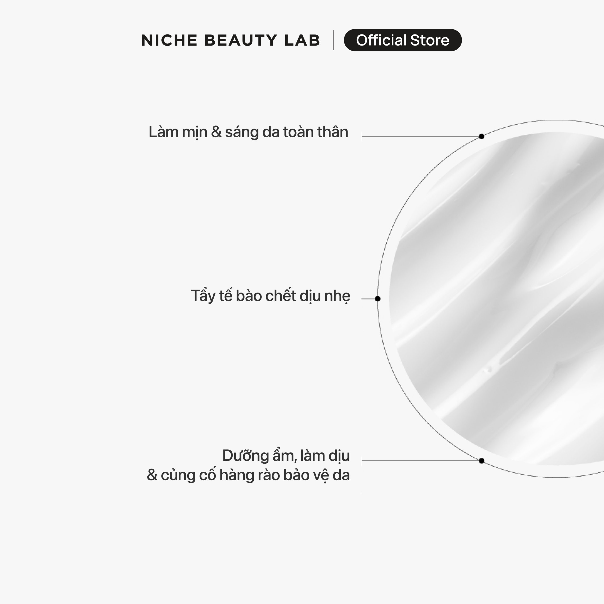 Việc thúc đẩy quá trình tái tạo bề mặt da còn giúp làm mờ dần các dấu hiệu lão hóa sớm như nếp nhăn li ti, đốm sậm màu, thâm sần và các khuyết điểm trên da cơ thể. Đồng thời, công thức bổ sung peptides và ectoine giúp làm dịu da, giảm kích ứng, tăng cường độ ẩm và củng cố hàng rào bảo vệ da trong suốt quá trình sử dụng.