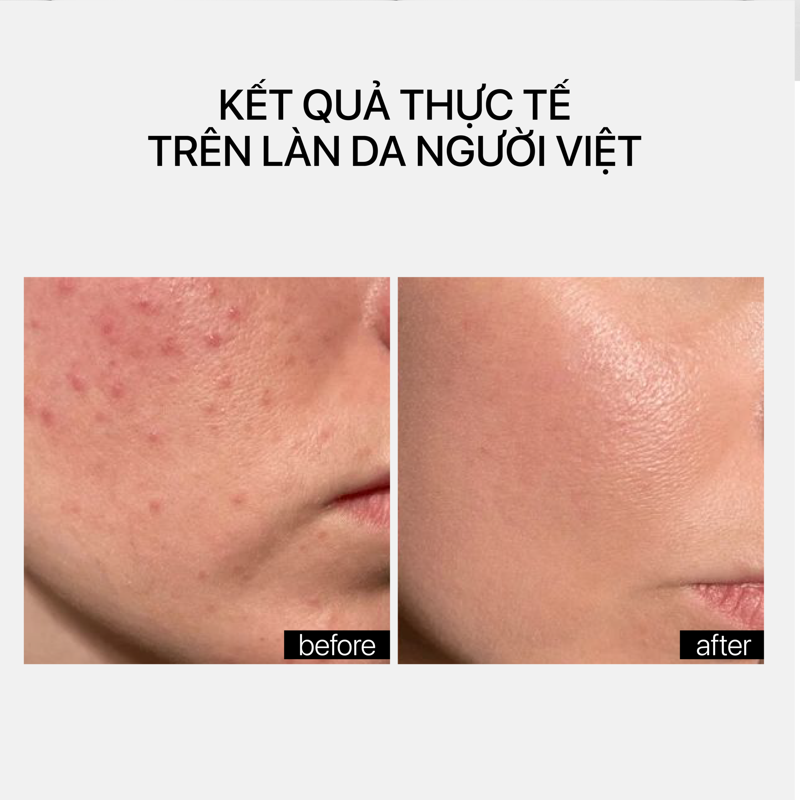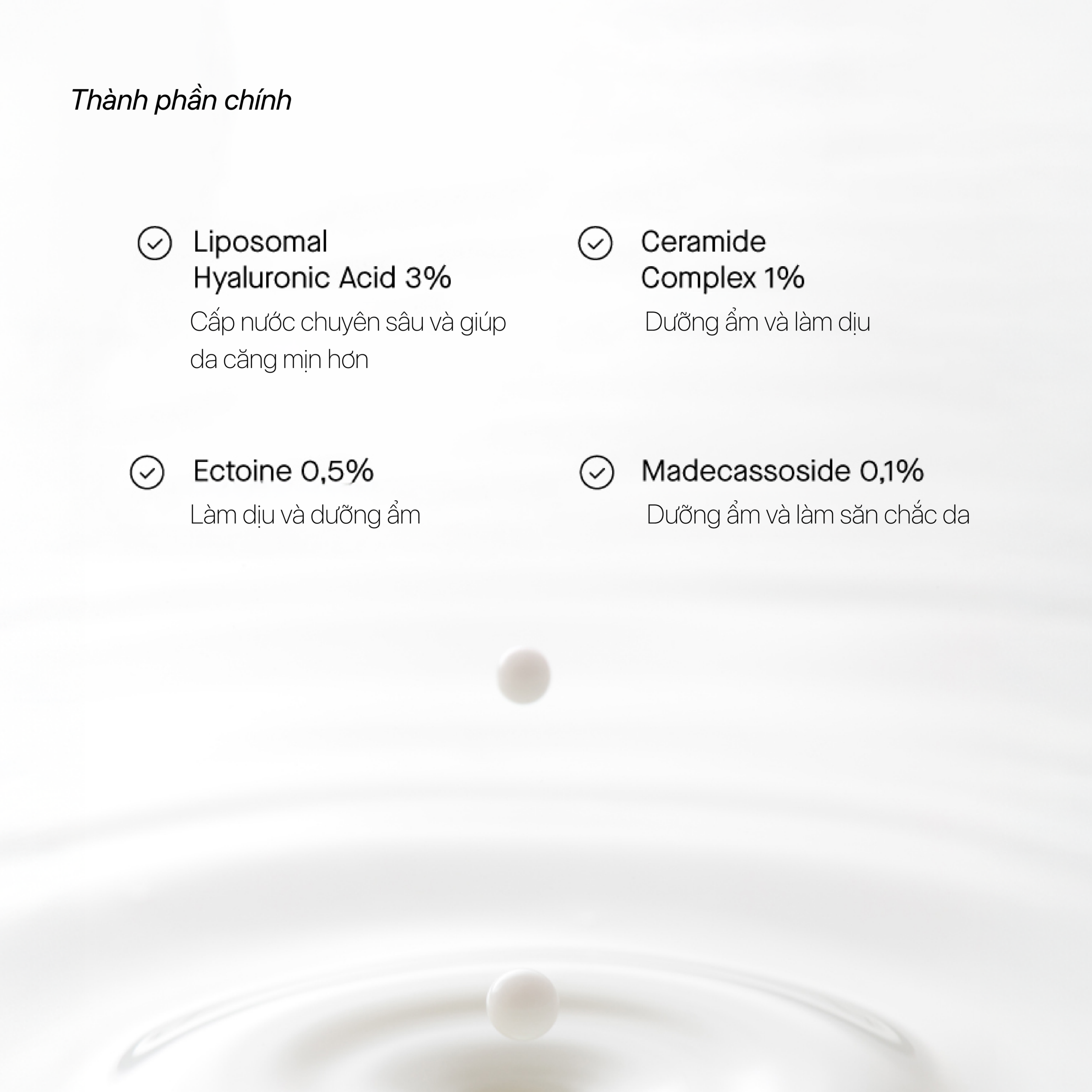 Sản phẩm kết hợp Hyaluronic Acid dạng bọc có khả năng thẩm thấu cao, giúp cấp ẩm từ bên trong lớp biểu bì, đồng thời hỗ trợ cải thiện độ đàn hồi và môi trường thuận lợi cho quá trình tái tạo da. Bên cạnh đó, Ectoine và Madecassoside góp phần làm dịu, bảo vệ da trước các tác nhân gây stress và hỗ trợ phục hồi làn da nhạy cảm hoặc da đang treatment.