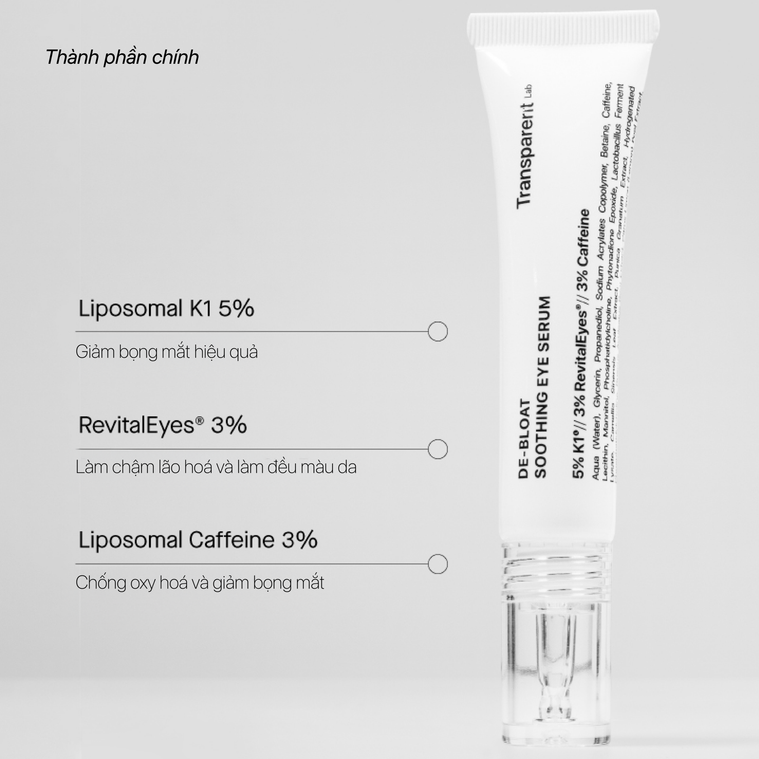 Công thức kết hợp Vitamin K1 dạng bọc giúp hỗ trợ cải thiện tuần hoàn mao mạch và giảm sự xuất hiện của quầng thâm. Sản phẩm đồng thời ứng dụng RevitalEyes® – phức hợp hoạt chất hỗ trợ cải thiện lưu thông máu, kết hợp cùng Caffeine dạng bọc giúp làm dịu vùng da sưng, mang lại diện mạo tươi tắn và rạng rỡ sáng hơn cho vùng mắt khi sử dụng đều đặn.