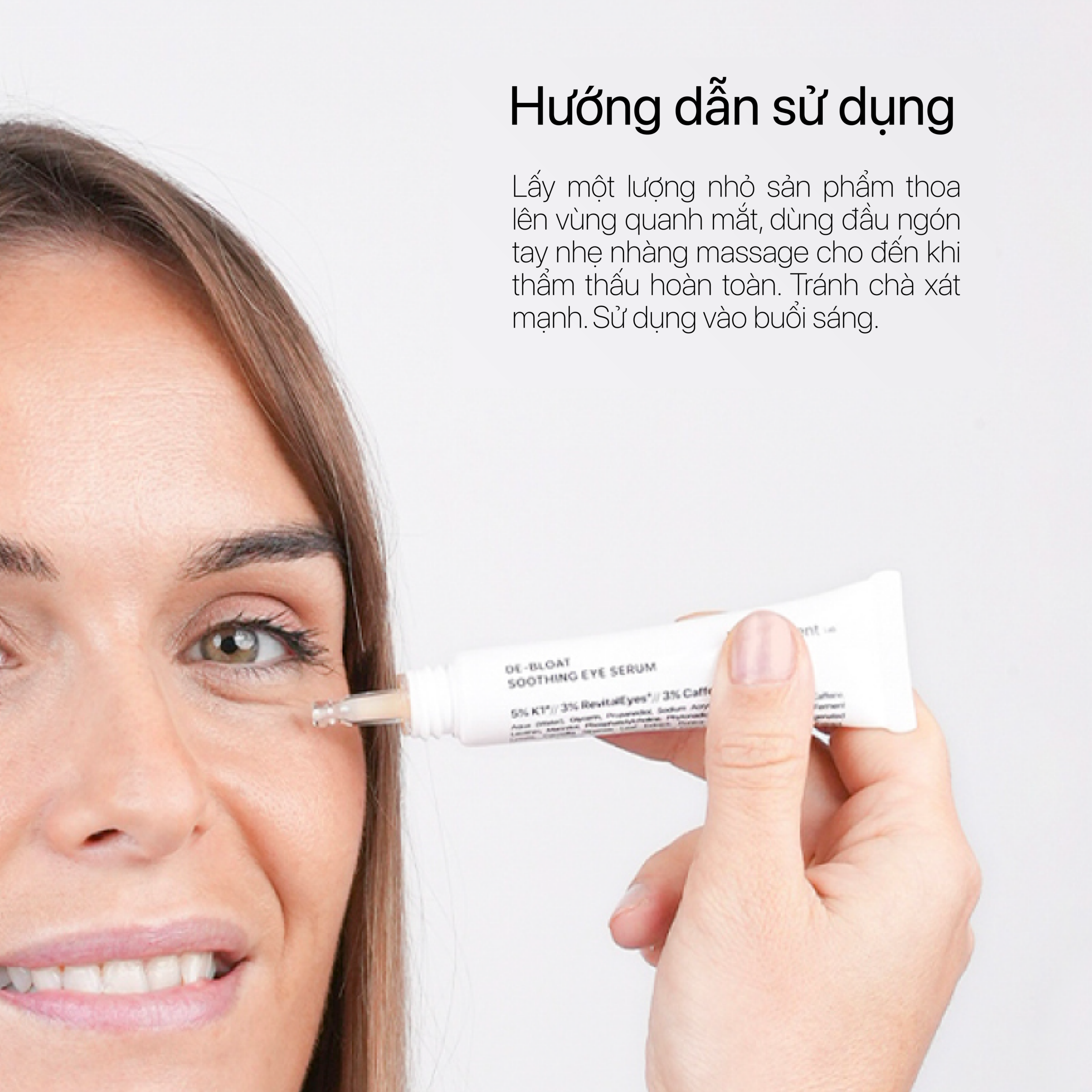 Lấy một lượng nhỏ sản phẩm thoa lên vùng quanh mắt, dùng đầu ngón tay nhẹ nhàng massage cho đến khi thẩm thấu hoàn toàn. Tránh chà xát mạnh. Sử dụng vào buổi sáng.