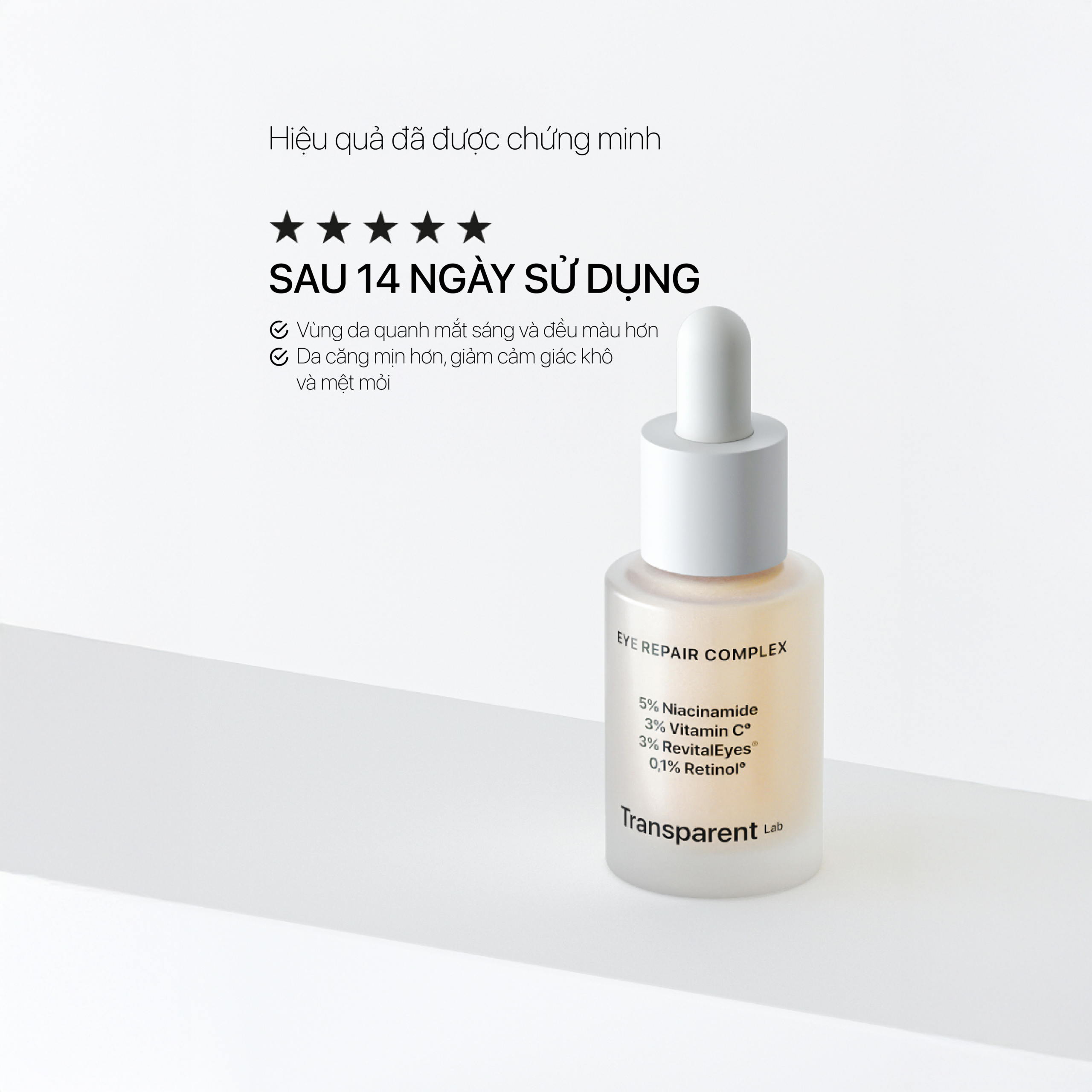 Eye Repair Complex được thiết kế chuyên biệt cho vùng da quanh mắt mỏng manh, kết hợp các hoạt chất chống lão hóa và dưỡng ẩm nhẹ nhàng, giúp giảm nguy cơ châm chích hay kích ứng. Với làn da nhạy cảm hoặc mới bắt đầu dùng retinol, có thể xuất hiện cảm giác nhẹ râm ran hoặc ửng đỏ tạm thời, nhưng tình trạng này sẽ nhanh chóng ổn định khi da đã quen dần với sản phẩm.
