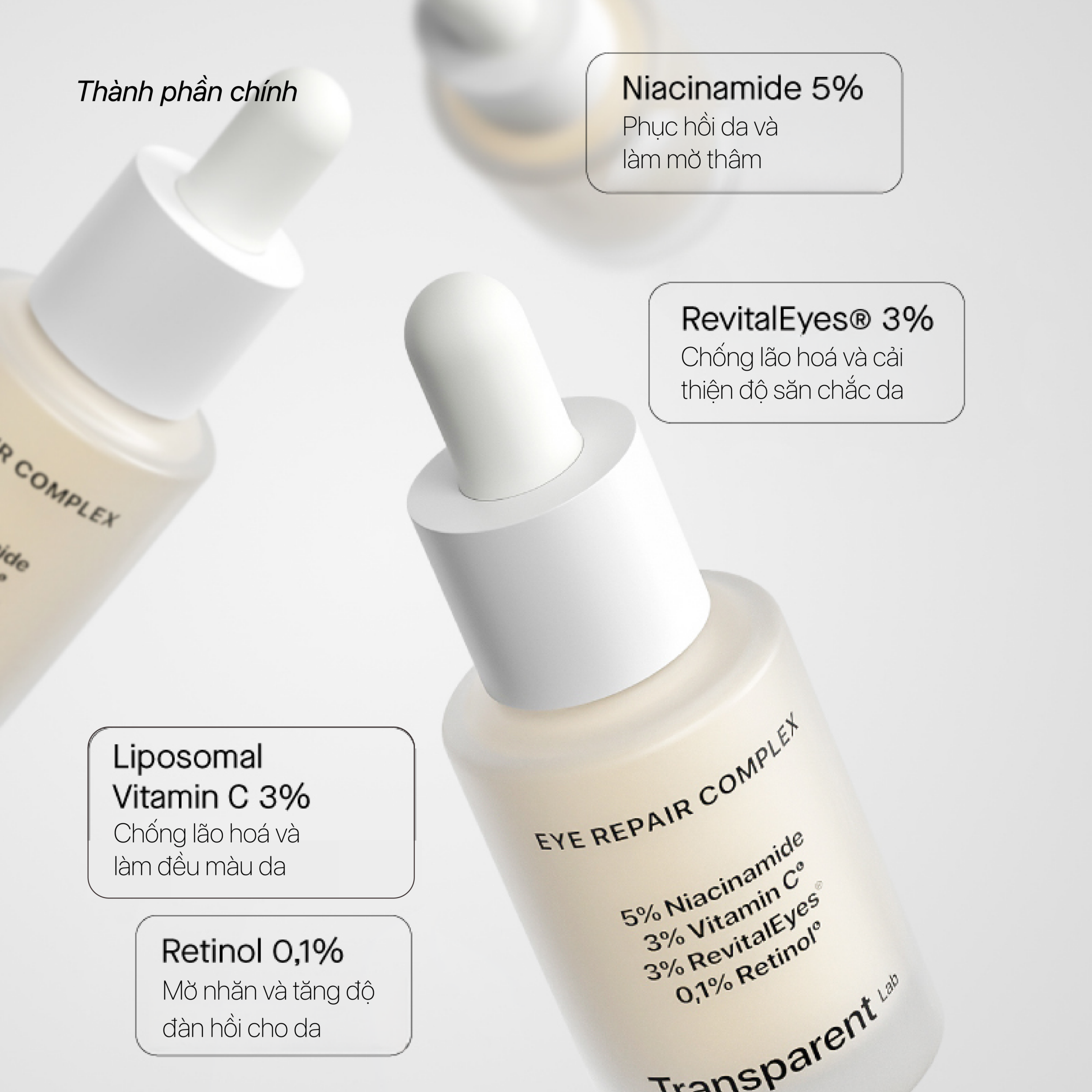 Eye Repair Complex là sản phẩm chăm sóc vùng da quanh mắt chuyên biệt, kết hợp các hoạt chất chống lão hóa và dưỡng ẩm để phục hồi độ ẩm, củng cố hàng rào bảo vệ da, đồng thời kích thích tổng hợp collagen giúp làm mờ nếp nhăn và đường chân chim. Sản phẩm cũng hỗ trợ cải thiện sắc tố không đều, giảm quầng thâm và làm sáng vùng da mỏng manh nhất trên khuôn mặt, giúp đôi mắt trông rạng rỡ, tươi trẻ hơn. Với các thành phần như 5% Niacinamide, 3% Encapsulated Vitamin C (*0,1% Pure Vitamin C), 3% RevitalEyes® và 0,1% Retinol, Eye Repair Complex mang đến hiệu quả toàn diện: dưỡng ẩm, phục hồi, chống oxy hóa và tái tạo vùng da quanh mắt.