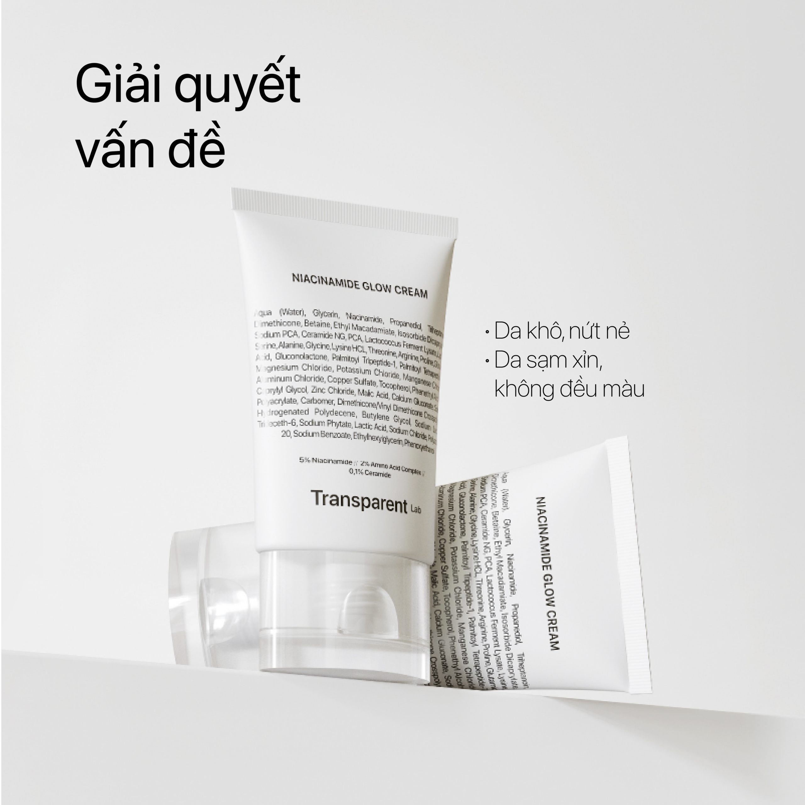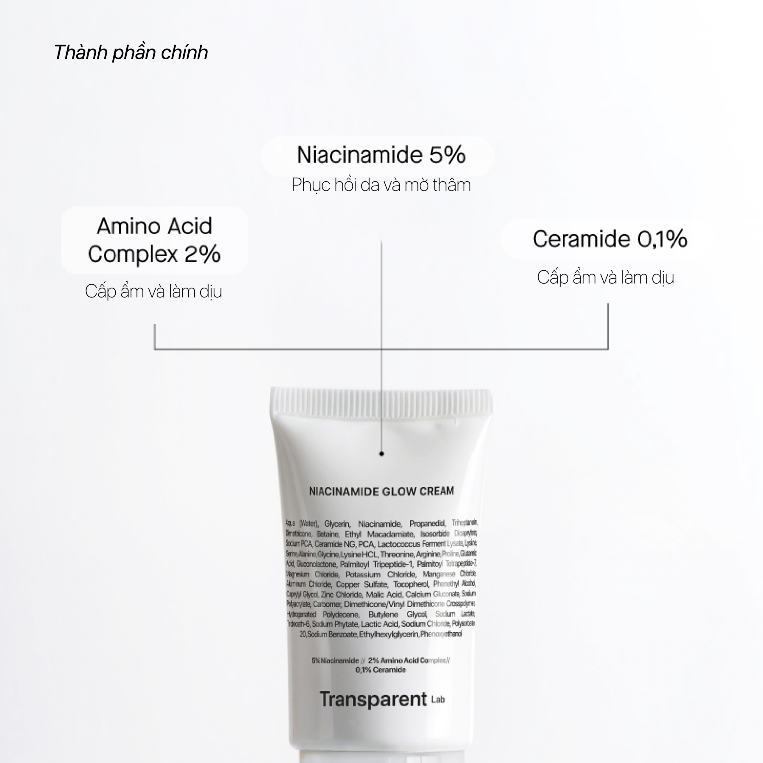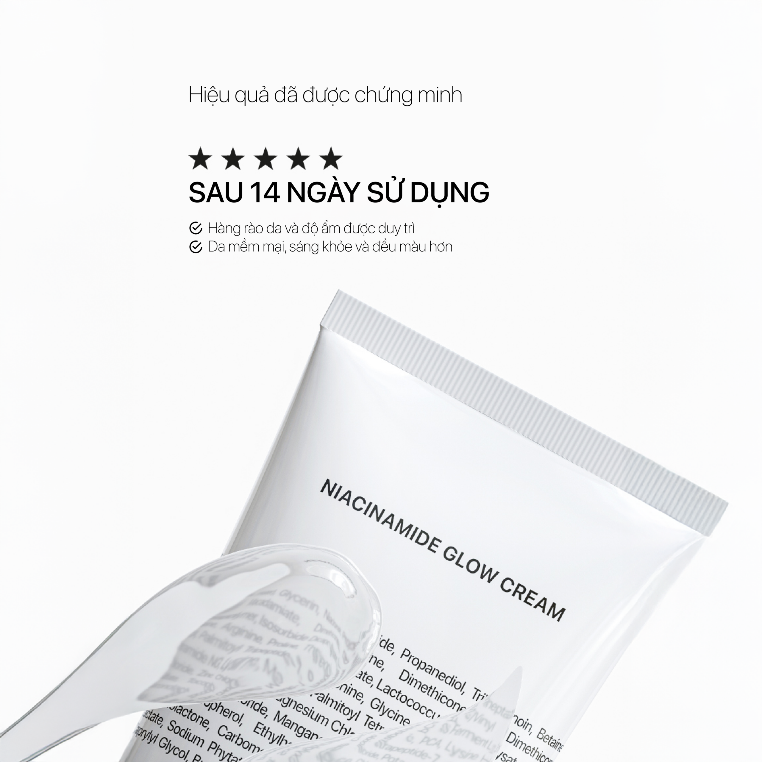 Không chỉ đơn thuần là một kem dưỡng sáng da, Niacinamide Glow Cream được phát triển dựa trên công thức khoa học cân bằng hoàn hảo giữa hiệu quả hoạt chất và độ an toàn tuyệt đối cho làn da nhạy cảm. Với 5% Niacinamide ở nồng độ chuẩn khoa học, sản phẩm giúp làm sáng, cải thiện tone da và giảm thâm hiệu quả mà vẫn nhẹ dịu, không gây kích ứng. Công thức còn được bổ trợ thông minh với Amino Acid Complex và Ceramide, hai hoạt chất giúp tăng cường hàng rào bảo vệ da, củng cố độ ẩm và duy trì sức khỏe bền vững cho làn da.