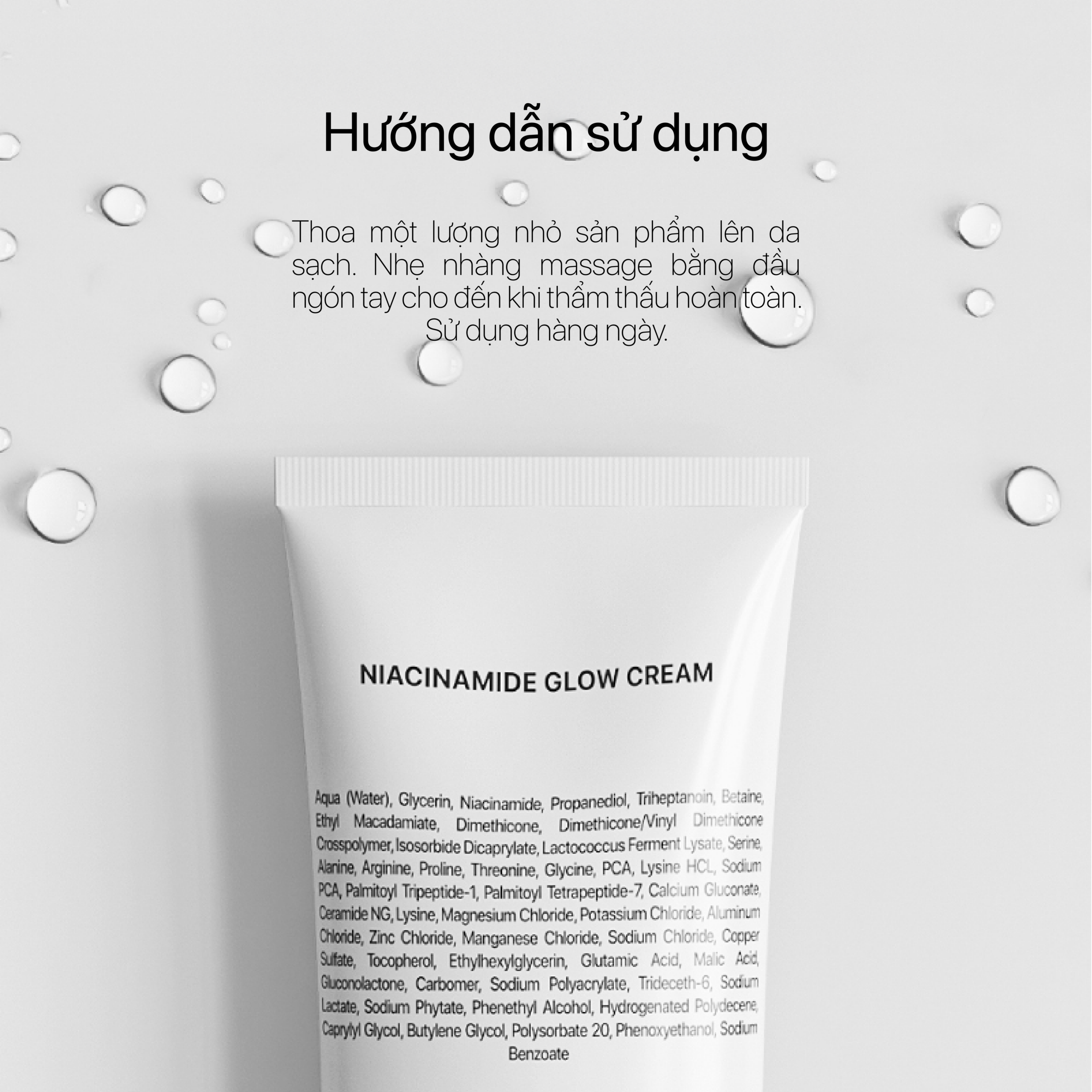 Niacinamide Glow Cream – kem dưỡng sáng da kết hợp sức mạnh của Niacinamide, Amino Acids và Ceramides trong kết cấu gel-cream mỏng nhẹ, thấm nhanh, phù hợp với mọi loại da, kể cả da nhạy cảm.