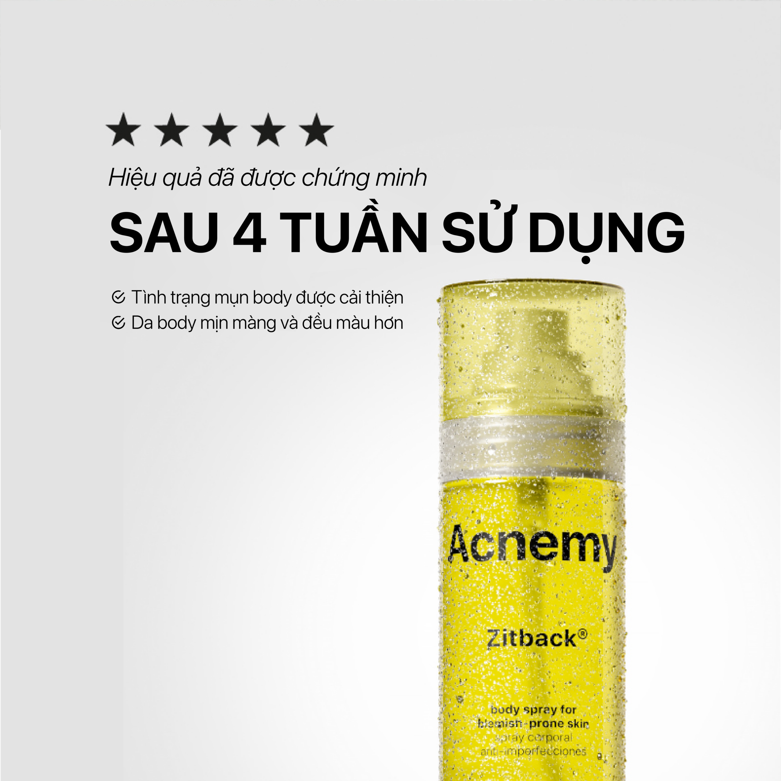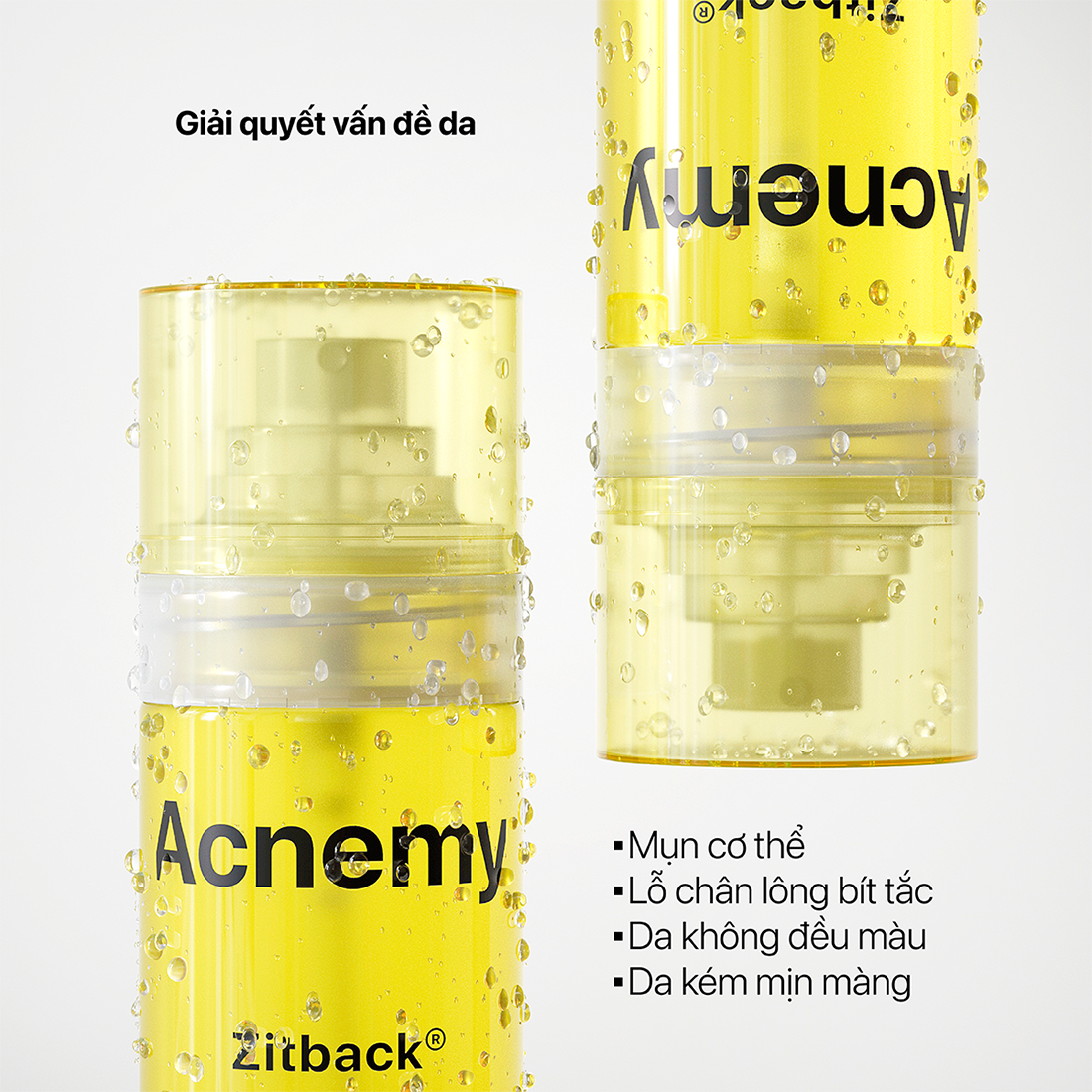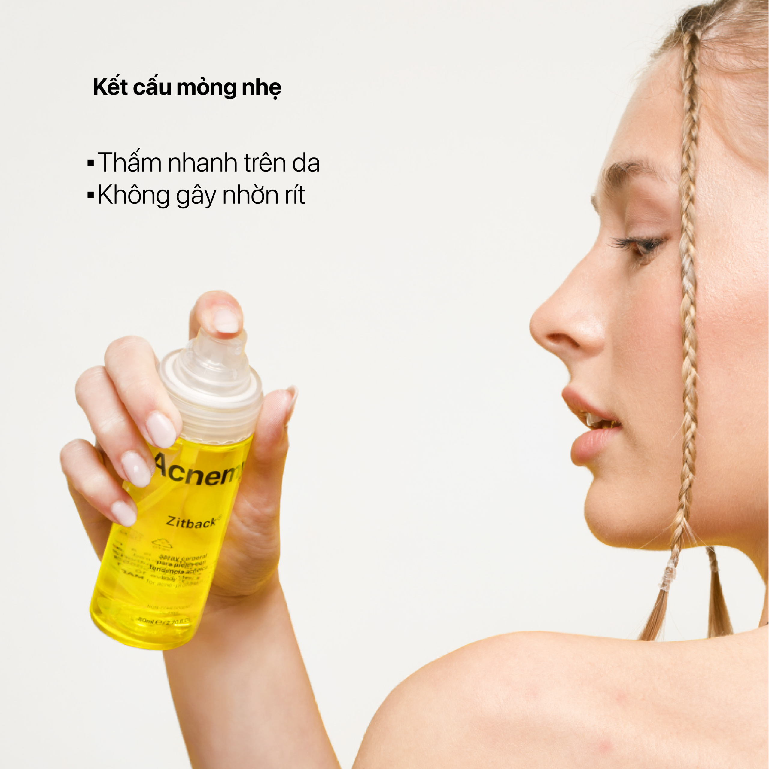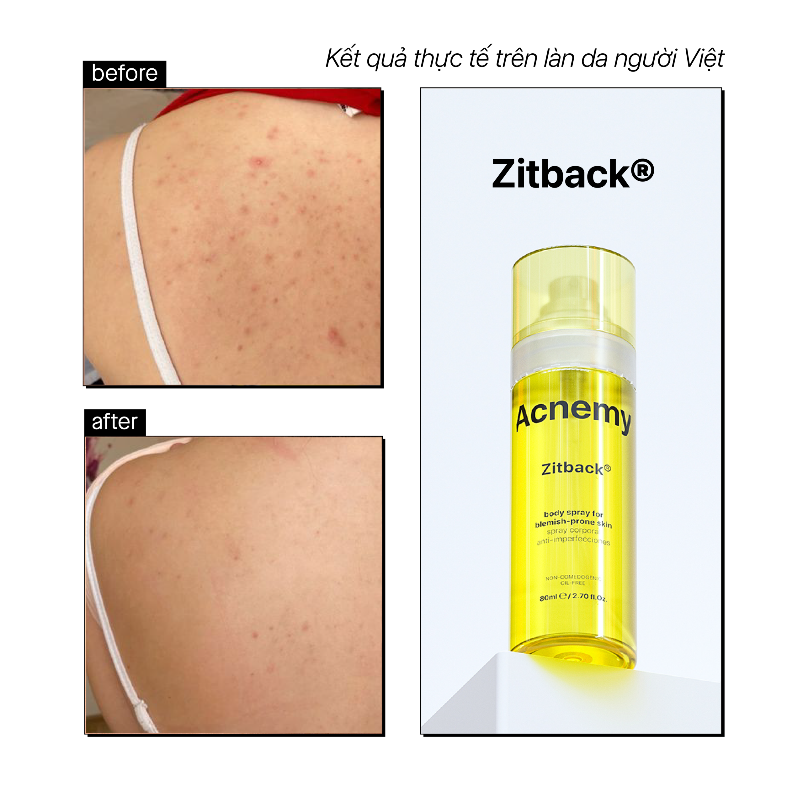 Zitback® là xịt mụn cơ thể khô nhanh – không dầu – không gây bít tắc, được thiết kế để xử lý hiệu quả các vùng da dễ nổi mụn như lưng, ngực, vai hay mông. Sản phẩm sở hữu nhóm AHA (Glycolic Acid) giúp làm khô cồi mụn, loại bỏ tế bào chết và làm thông thoáng bề mặt da mà không gây kích ứng. Kết hợp cùng nước chanh (Citrus Limon Fruit Water) – một nguồn tẩy tế bào chết tự nhiên – sản phẩm hỗ trợ ngăn ngừa hình thành mụn đầu đen và cải thiện bề mặt da sần thô.
