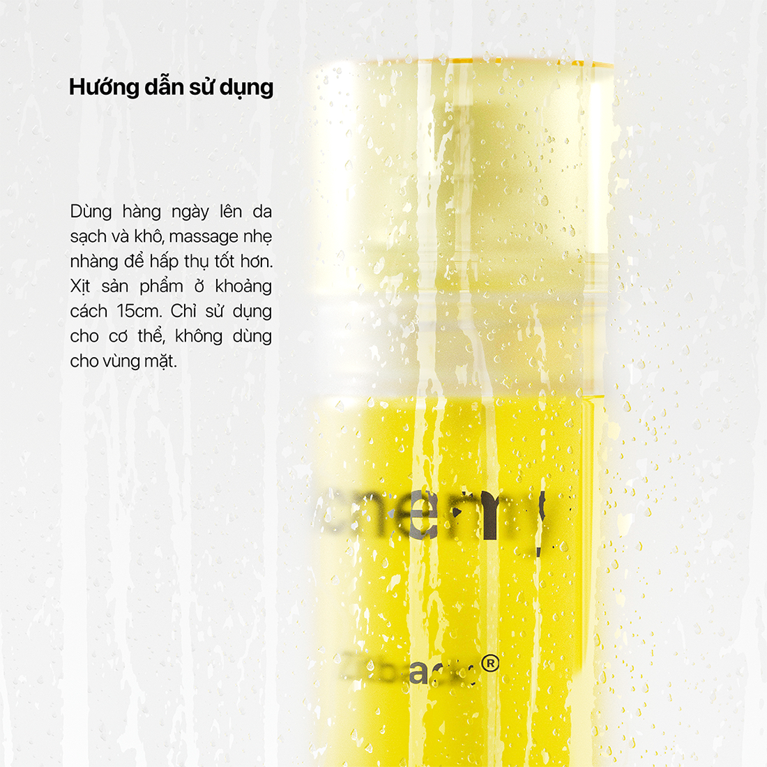 Dùng hàng ngày lên da sạch và khô, massage nhẹ nhàng để hấp thụ tốt hơn. Xịt sản phẩm ở khoảng cách 15cm. Chỉ sử dụng cho cơ thể, không dùng cho vùng mặt.